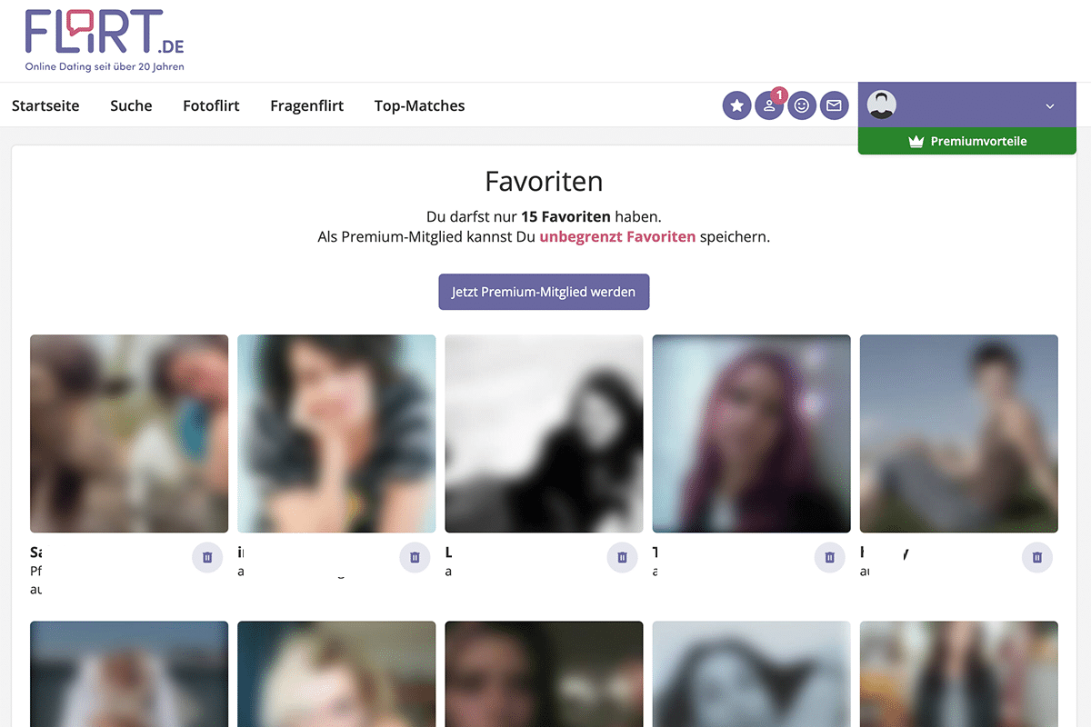 Du benötigst eine Premium-Mitgliedschaft, um Flirt.de vollumfänglich nutzen zu können. Du kannst aber mit der kostenlosen Basis-Mitgliedschaft die Plattform ausgiebig und zeitlich unbegrenzt testen und nutzen. Für einen Wechsel zu einer Premium-Mitgliedschaft kannst Du so lange testen wie Du möchtest. So erhältst du also einen guten Eindruck, ob Flirt.de zu Dir passt. Die Kosten für die Premium-Mitgliedschaften sind im Vergleich zu anderen Singlebörsen günstig: